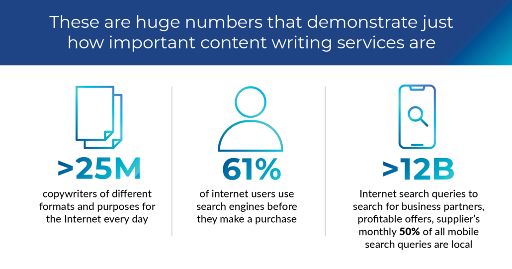 Diese Zahlen zeigen, wie wichtig Content-Erstellung ist. Für eine effiziente Website-Verwaltung ist Content-Erstellung unumgänglich. Content fördert Traffic, bringt Ihnen neue Abonnenten und Neukunden und führt zu einer höheren Conversion Rate. Daher wird diese Dienstleistung sowohl bei kleinen und regionalen als auch bei großen und bekannten Unternehmen immer beliebter.