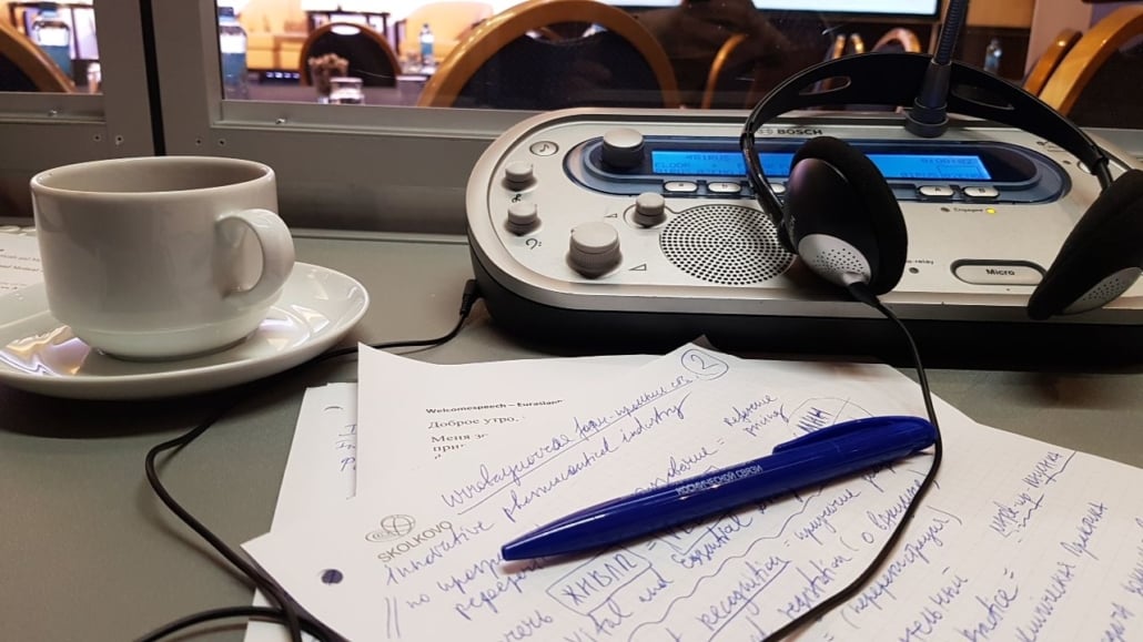Alles beginnt mit der Vorbereitung. Als Dolmetscher kann man sich nicht einfach in die Kabine setzen und bei einem konventionellen Apothekerforum, einem Roundtable-Meeting zur Einführung von Arzneimitteln in die EAWU oder den EU-Markt oder eine Podiumsdiskussion zu Thema Kennzeichnungen mit dem Simultandolmetschen beginnen. Erfahrung ist der Schlüssel.