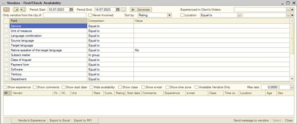 Dieses Tool zeigt eine Liste von Vendoren basierend auf bestimmten Auswahlkriterien sowie deren Verfügbarkeit zu bestimmten Terminen.