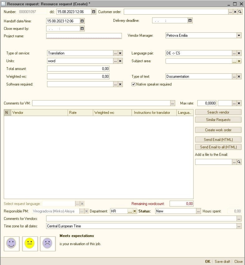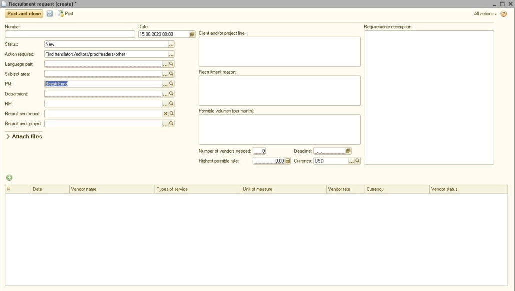 Die Rekrutierungsanforderung wird an den Ressourcenmanager gesendet, um die Rekrutierung neuer Talente einzuleiten. Diese Rekrutierungsanforderung kann eingereicht werden, wenn vorhandene Ressourcen knapp sind oder ein Unternehmen in neue Geschäftsfelder expandiert, beispielsweise durch die Gewinnung neuer Kunden, neue Sprachpaare usw.