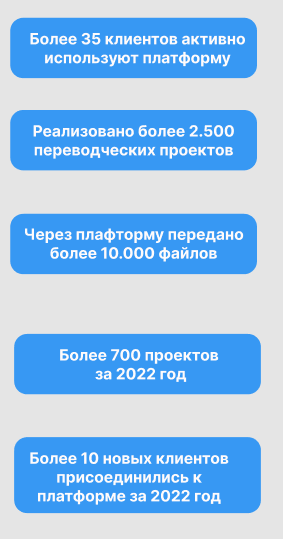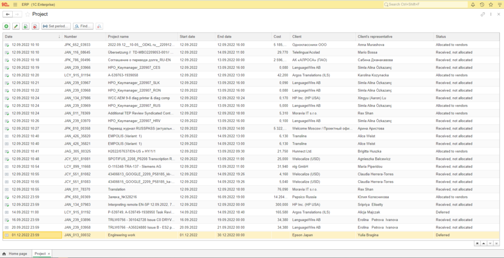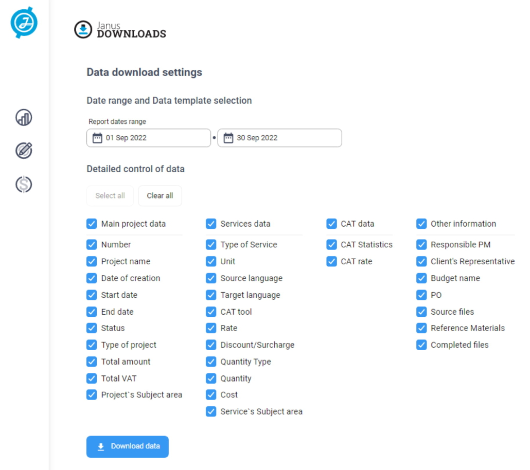 Some of our clients need to generate specific reports on their translation activities. For this purpose, the ability to download all data on translation projects has been implemented. There is a choice of more than 30 parameters in this section and the data are exported in a convenient Excel format.